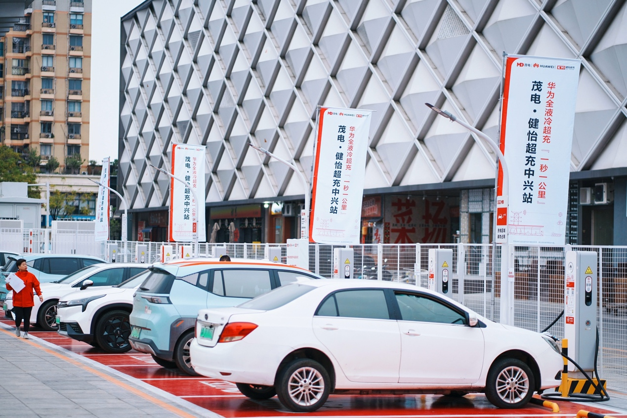 茂电・健怡超充中兴站是华夏金融租赁有限公司与广东健怡能源有限公司携手合作、联合华为数字能源打造的标杆超充项目。项目搭载华为全液冷超充技术装备,进一步完善区域超充网络布局,为绿色能源出行注入强劲动力。