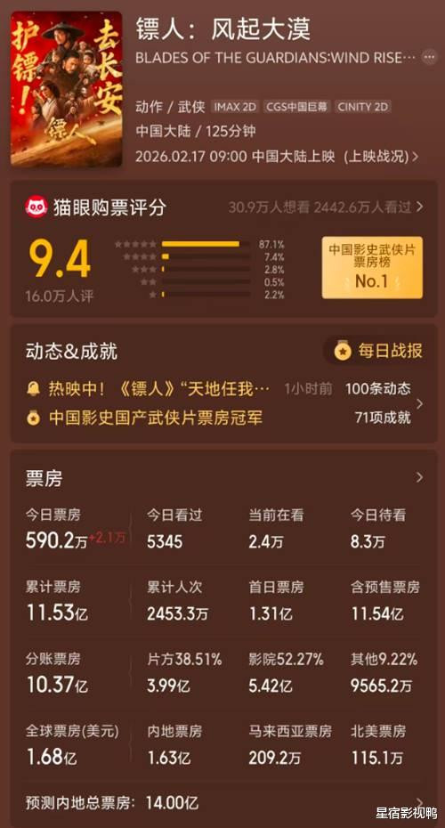 虽然14亿的预测票房尚且有些差距,但是作为春节档“三巨头”中口碑最好的一部,《镖人》稳定的票房涨势颇为乐观。